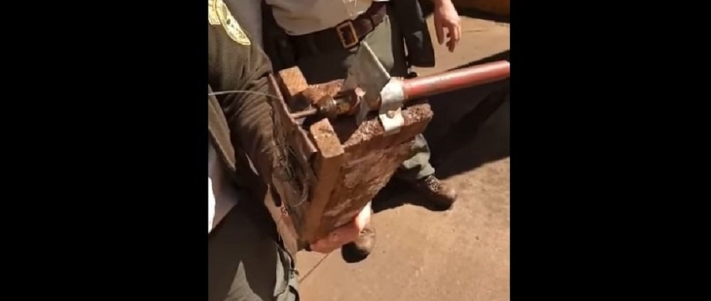 una trampera para ratas, un trozo de madera, un pico de gas y un caño.