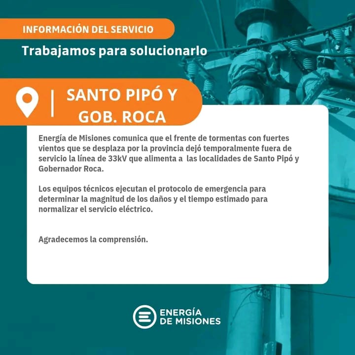 En paralelo, Energía de Misiones comunicó que la línea de 33 kV que alimenta a Santo Pipó y Gobernador Roca también salió de funcionamiento debido a las ráfagas que acompañaron al temporal. La empresa indicó que sus equipos técnicos activaron el protocolo de emergencia para evaluar el alcance de las fallas y definir el tiempo estimado para la normalización.