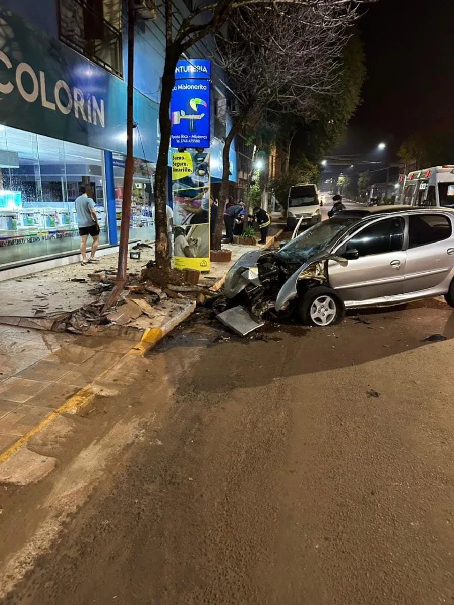 En la localidad de Puerto Rico, un automóvil despistó en la avenida Nueve de Julio y terminó impactando contra un árbol y un poste de alumbrado público.