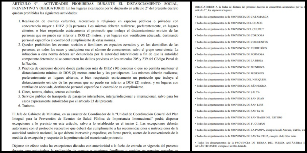 El DNU se dictó con el "objeto de proteger la salud pública, lo que constituye una obligación indelegable del Estado nacional en el marco de la declaración de pandemia emitida por la Organización Mundial de la Salud (OMS), con fecha 11 de marzo de 2020, y de la emergencia pública en materia sanitaria ampliada por el Decreto N° 260/20 y su modificatorio, y en atención a la situación epidemiológica existente en las distintas regiones del país con relación al Covid-19", dice el texto.