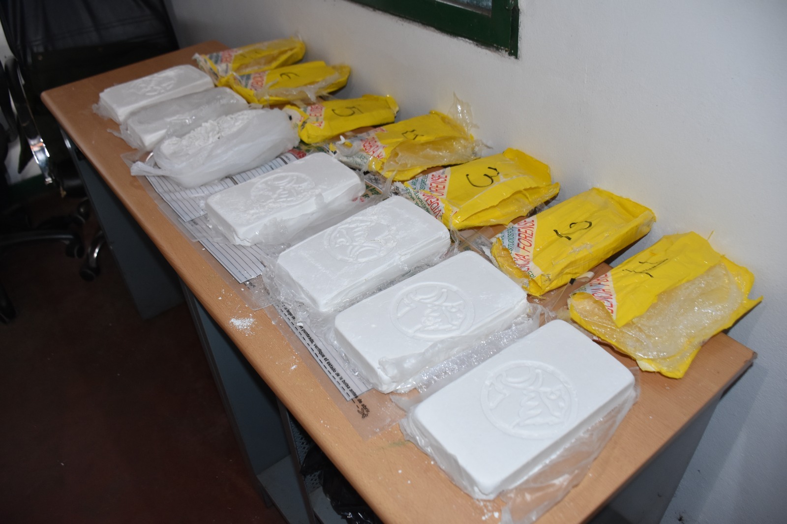 Con asistencia del Personal del Grupo Criminalística y Estudios Forenses de la Unidad, se realizó la prueba de campo “NARCOTEST”, arrojando resultado cromáticamente POSITIVO, para CLORHIDRATO DE COCAÍNA, y el total de SIETE (7) paquetes rectangulares de dicha sustancia, arrojando un peso total de SIETE MIL SEISCIENTOS TREINTA GRAMOS CON ONCE CENTIGRAMOS (7.630,11).